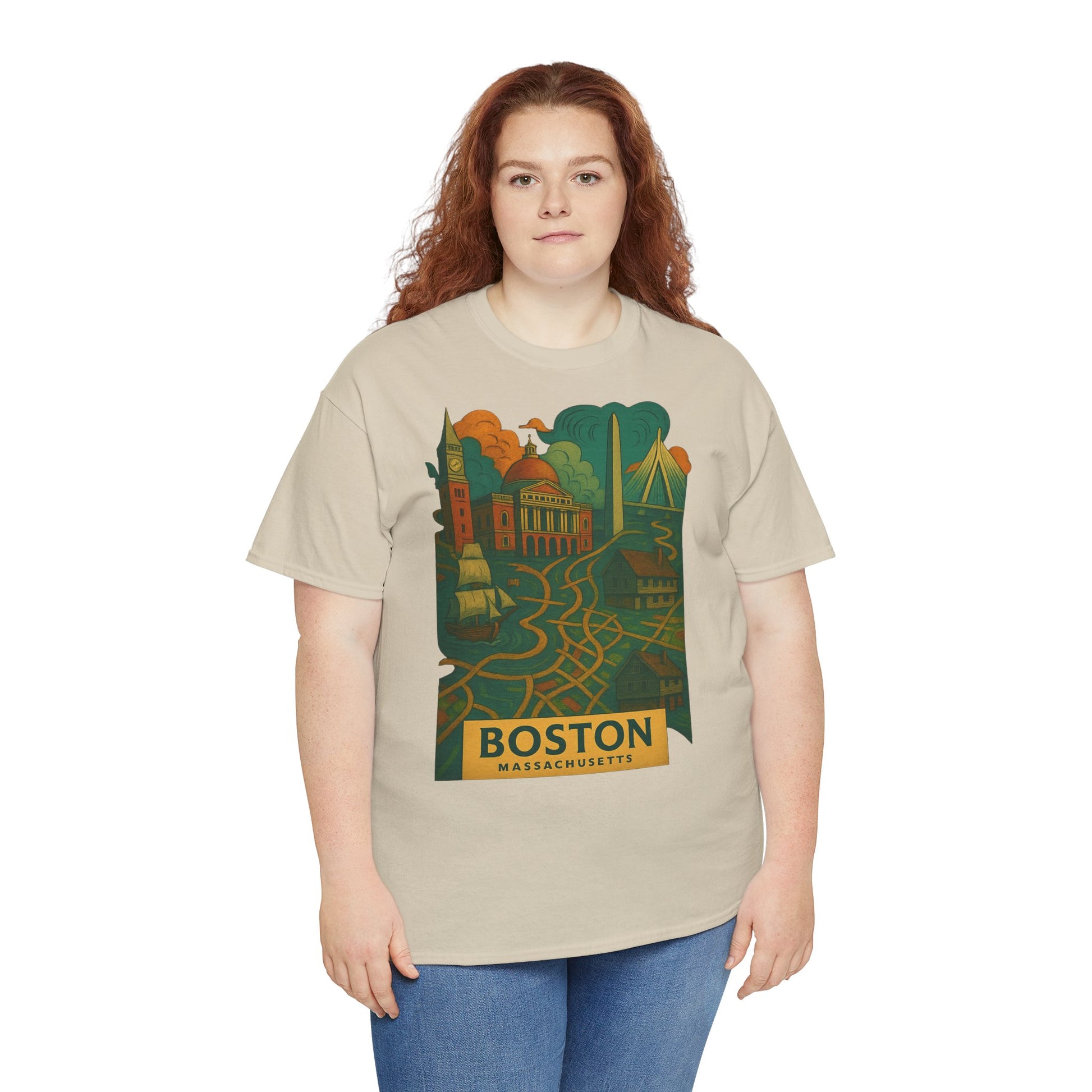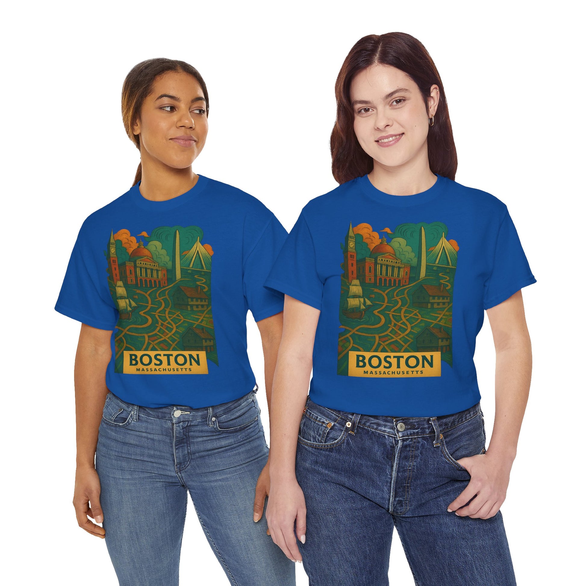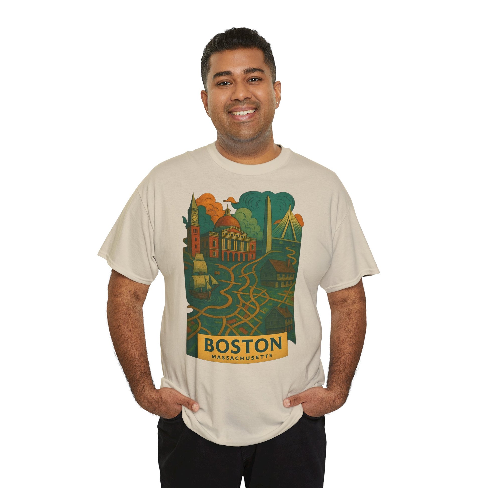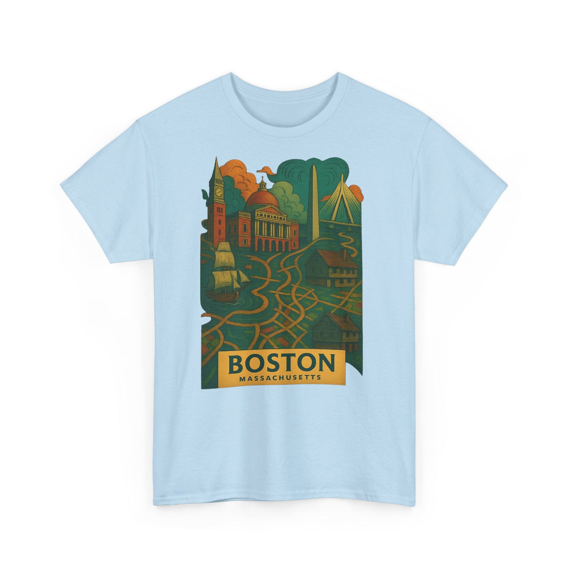 Discover the perfect blend of style and comfort with this Unisex Heavy Cotton Tee, featuring a stunning print inspired by iconic Boston landmarks. This tee exudes a vibrant and cheerful vibe, making it an ideal addition to your casual wardrobe or a unique gift for travel enthusiasts.