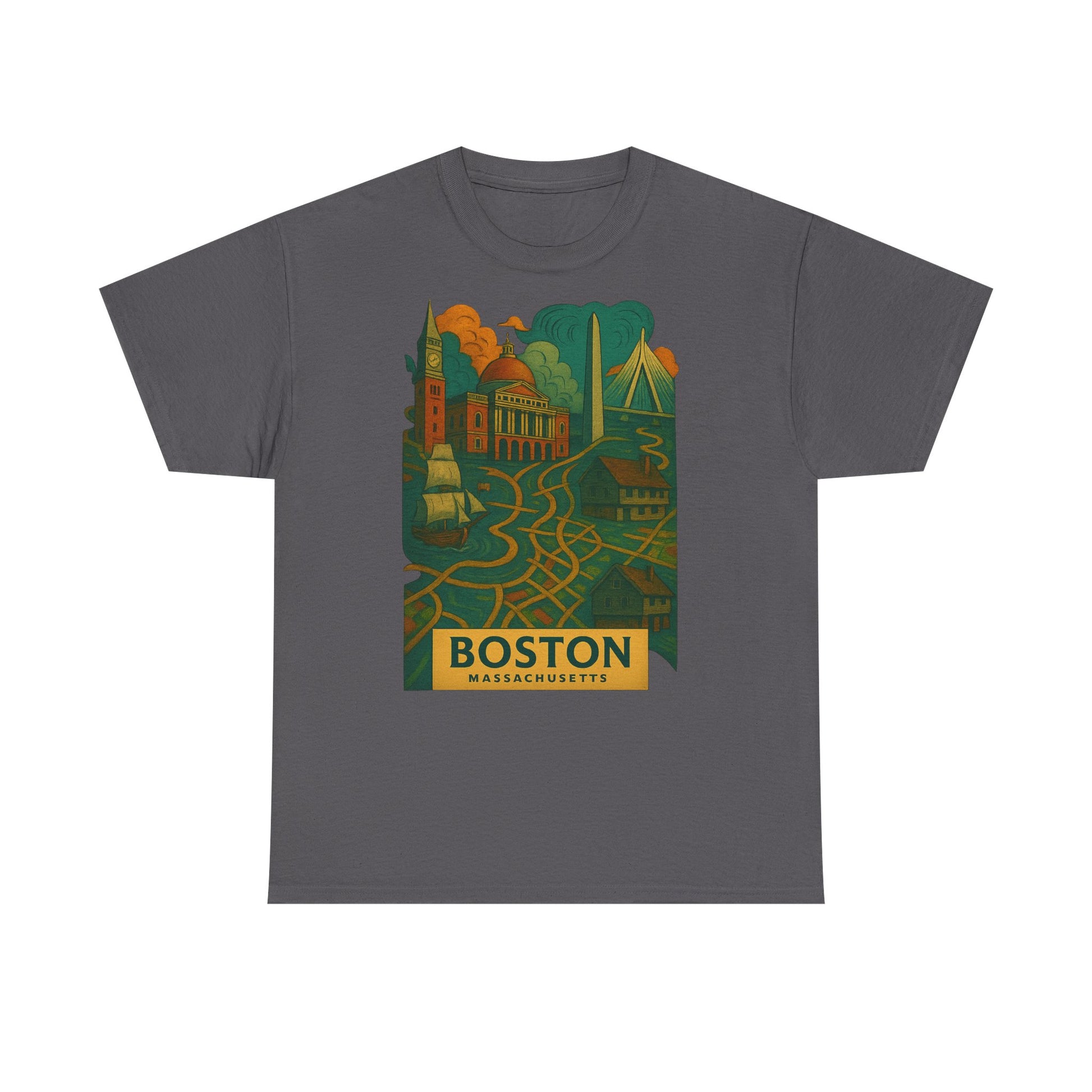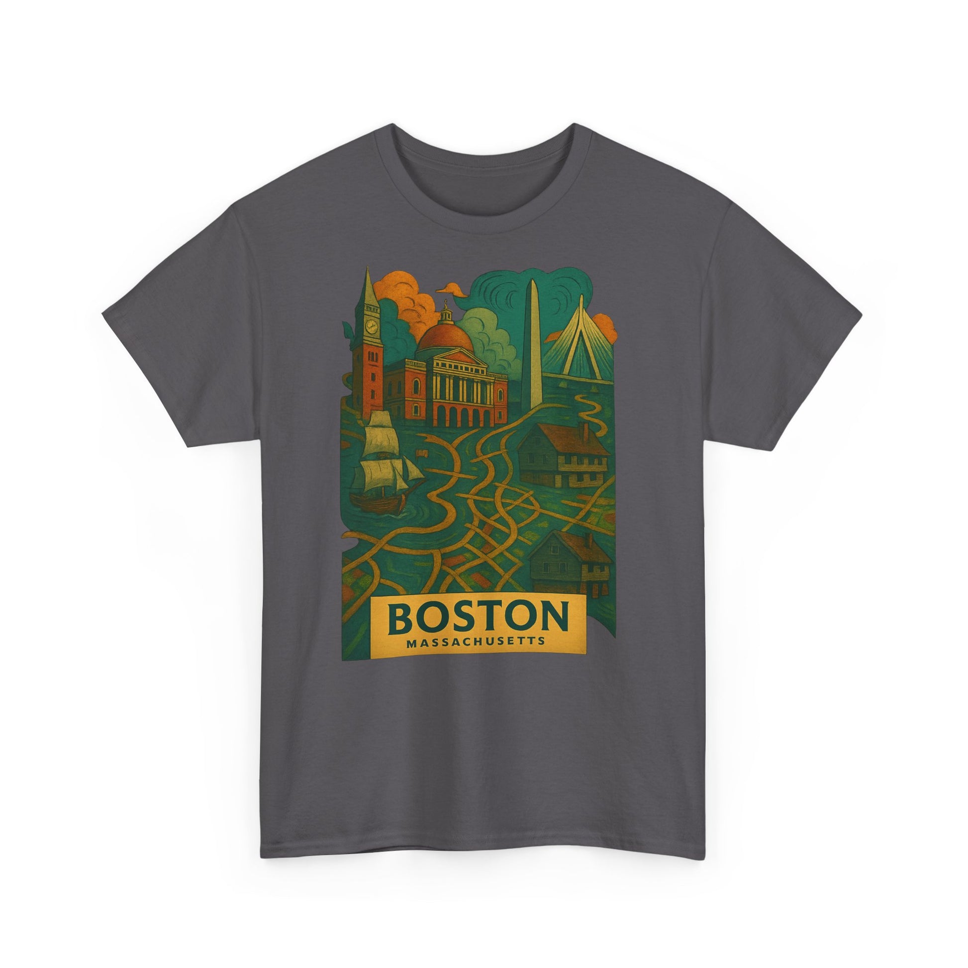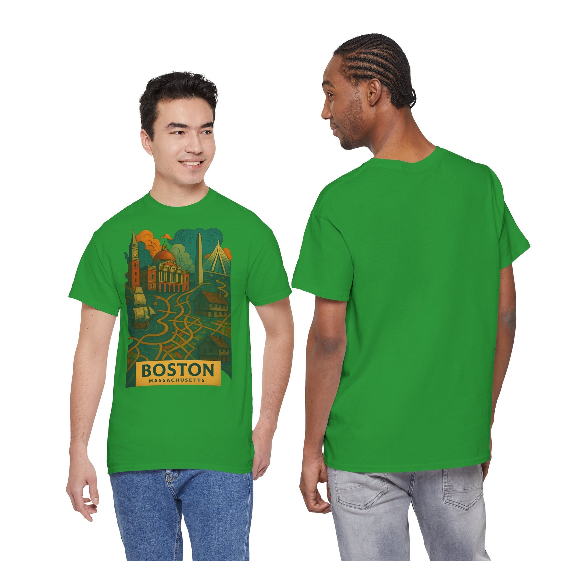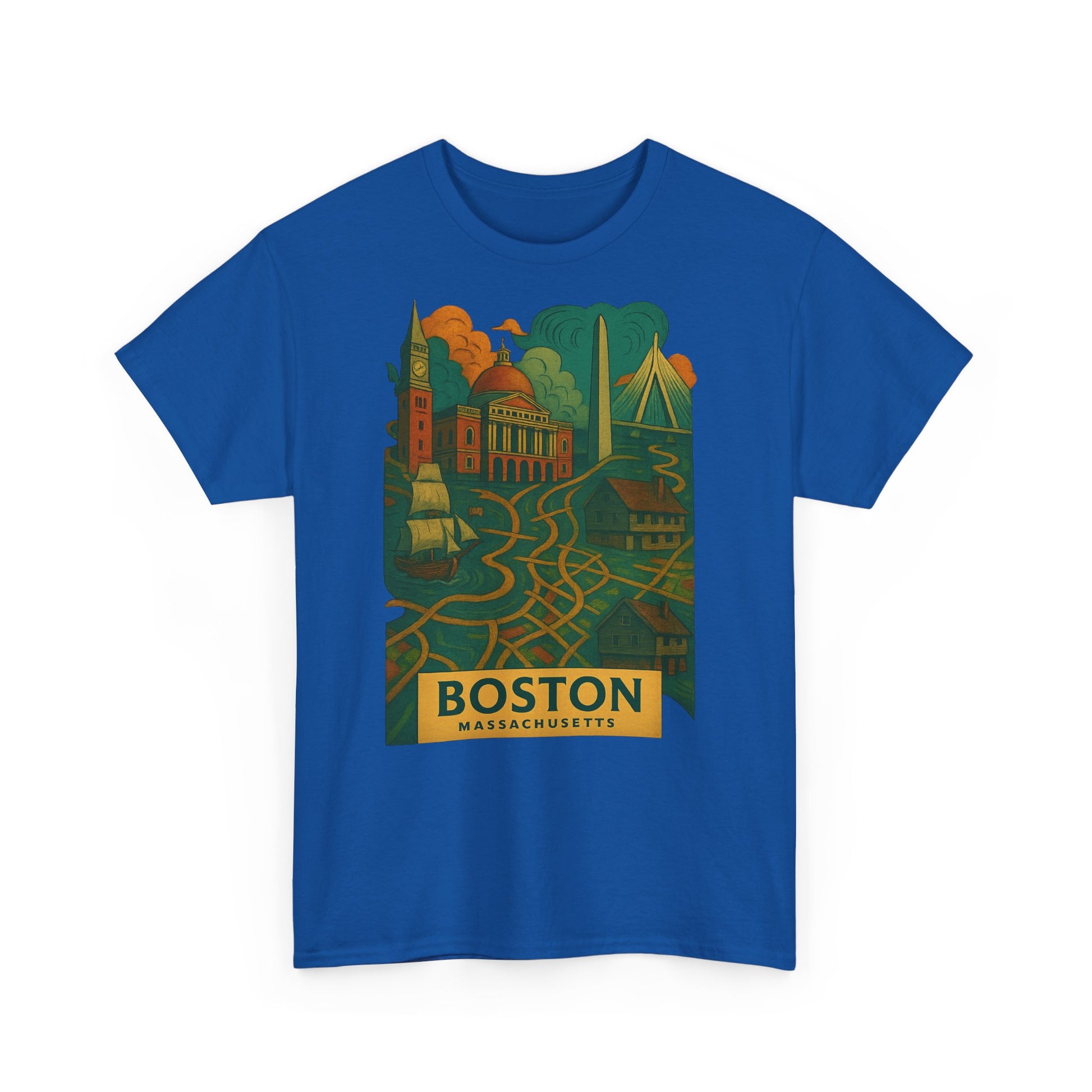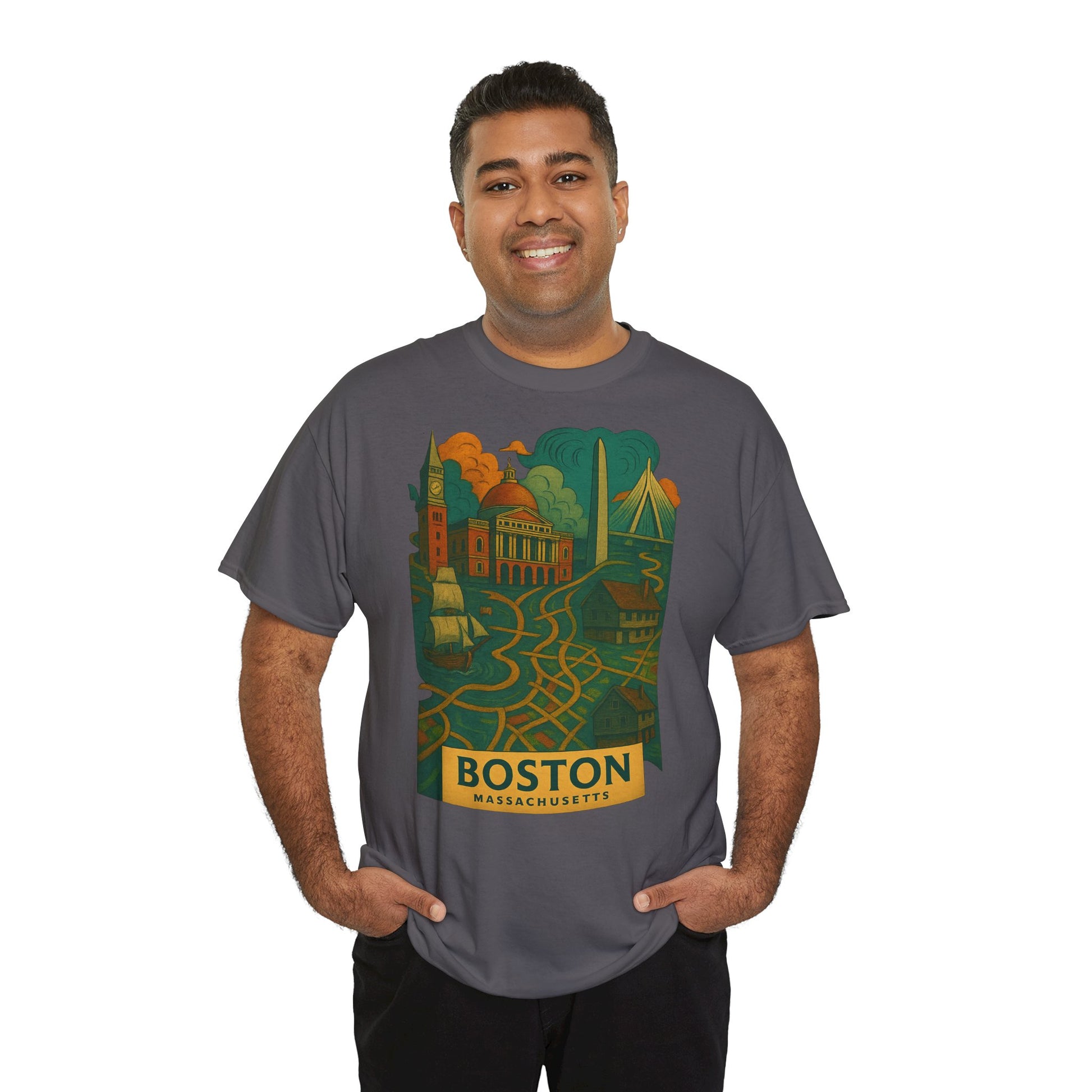 Discover the perfect blend of style and comfort with this Unisex Heavy Cotton Tee, featuring a stunning print inspired by iconic Boston landmarks. This tee exudes a vibrant and cheerful vibe, making it an ideal addition to your casual wardrobe or a unique gift for travel enthusiasts.
